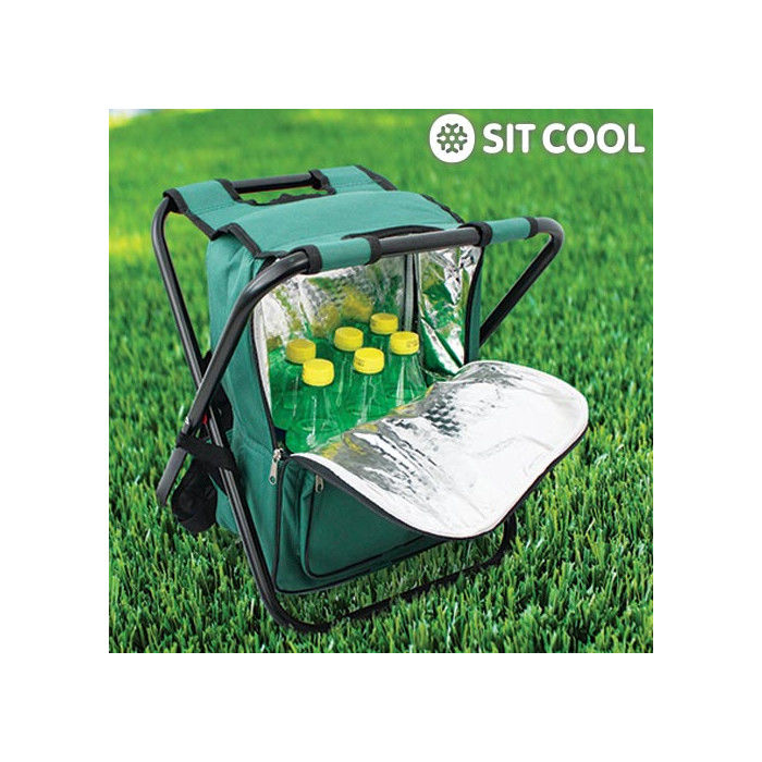 La chaise pliable Sac Isotherme et Sac à Dos Sit Cool 3 en 1 est idéal pour vos escapades à la campagne ou à la plage ! La chaise a une structure métallique très résistante avec un siège matelassé (40 cm de hauteur). Le sac isotherme conserve au frais les canettes, les bouteilles, et les aliments pendant des heures (capacité : 18 canettes de rafraichissement ou divers bouteilles de 1,5 - 2 l). Le sac à dos inclut deux poches supplémentaires, idéales pour garder vos documents, votre porte-monnaie et même votre smartphone ou votre tablette tactile. De plus, Sit Cool 3 en 1 est très facile à transporter, grâce aux deux bretelles matelassées du sac à dos, qui vous permettent de la porter sur le dos, et à sa petite poignée qui permet de la tenir à une main. Poids max. supporté env. : 100 kg.