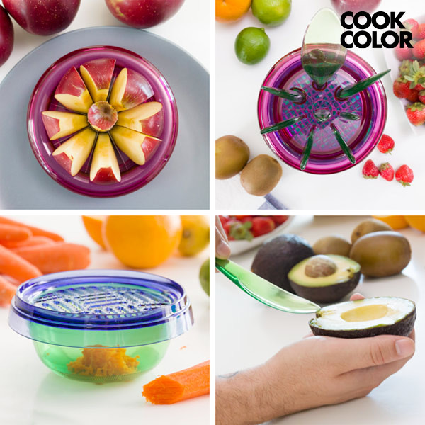 Alliez originalité et utilité dans la décoration de votre cuisine avec les ustensiles de cuisine empilables Multi Tool Fruit Cook Color ! Une plante de décoration originale et pratique composée de plusieurs ustensiles de cuisine regroupés pour occuper un minimum d'espace : bol, petit presse-agrumes, grand presse-agrumes, râpe, coupeur, coupe-pommes, broches, pèle-agrumes, presse-purée, cuillère à avocats et kiwis.