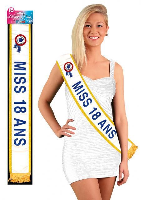 Sur la face visible de l'écharpe il y a une médaille marquée "Joyeux anniversaire" et le message "Miss 18 ANS" écrit en bleu.