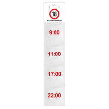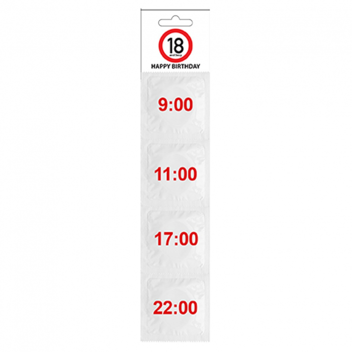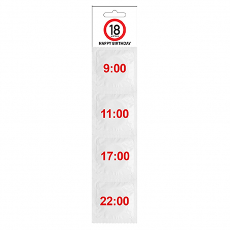 Ce kit de préservatifs pour un anniversaire de 18 ans se compose de 4 préservatifs humoristiques avec les différentes heures pour s'en servir à l'âge de 18 ans.