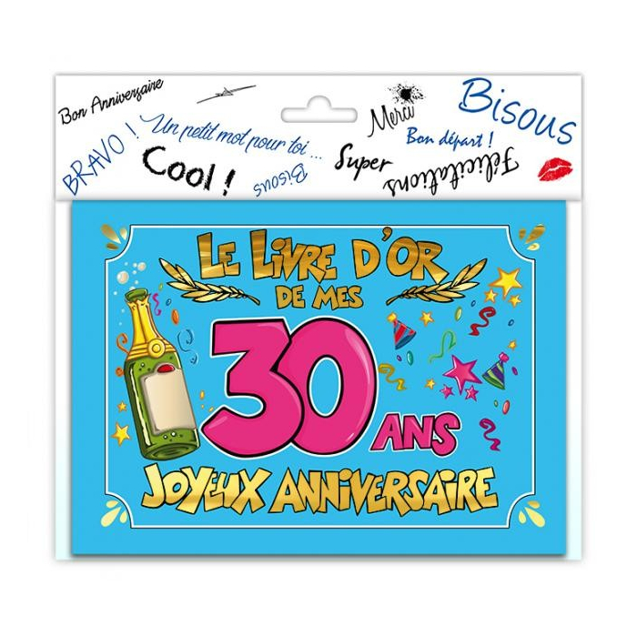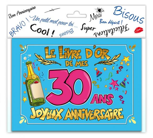 Le livre d'or est marqué "Le livre d'or de mes 30 ans" avec champagne et cotillons en couverture.