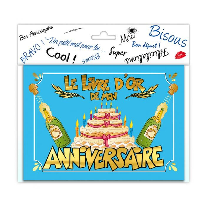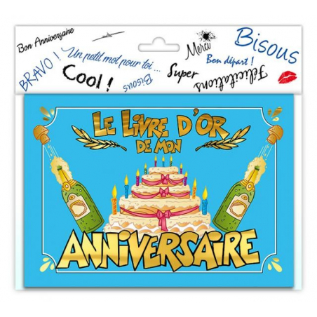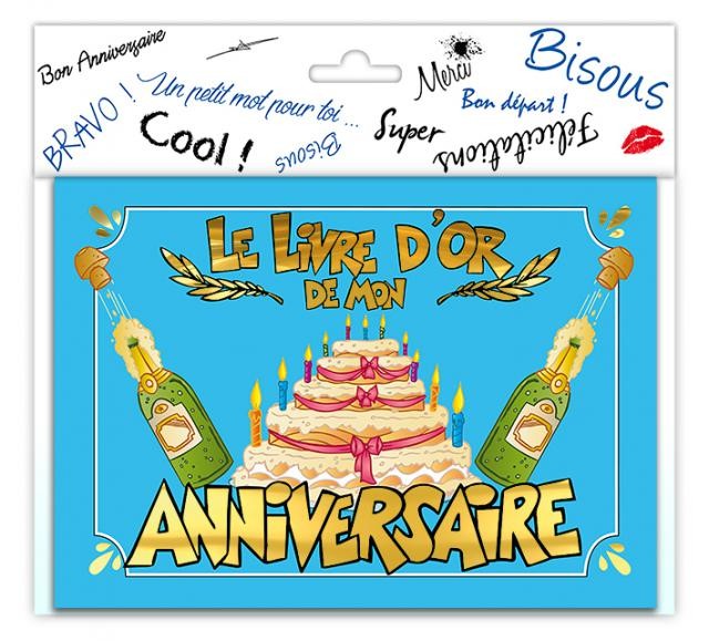 Le livre d'or est marqué "Le livre d'or de mon anniversaire" avec un gateau, des bougies et des bouteilles de champagne qui pétillent en couverture.