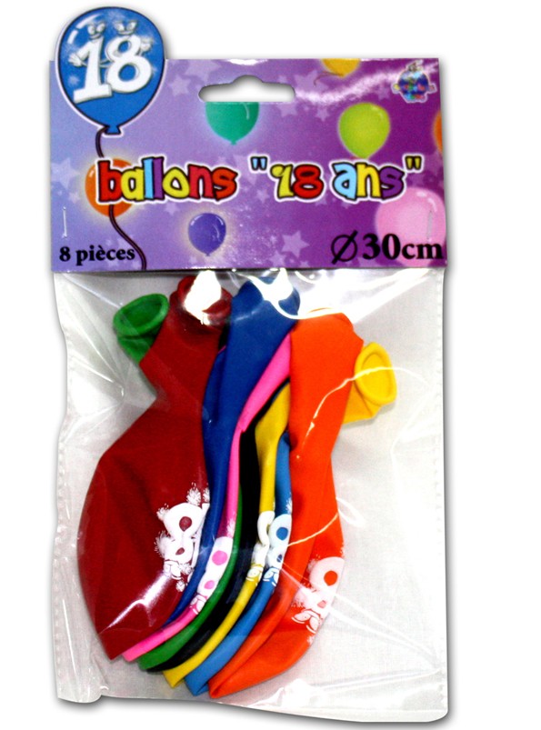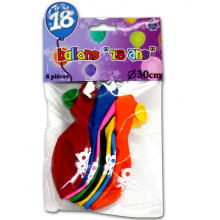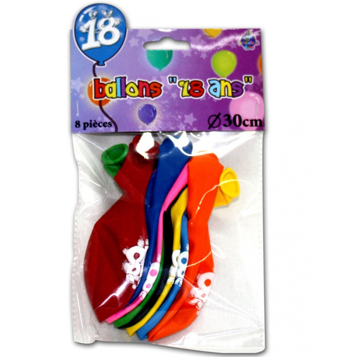Nous vous proposons ce lot de 8 ballons "18 ans" de 30 cm de diamètre.