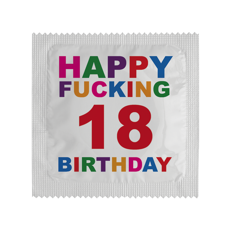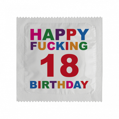 Préservatif humoristique HAPPY FUCKING 18 ANS en latex. Fabriqué en France aux normes NF et CE. Vendu à l'unité.