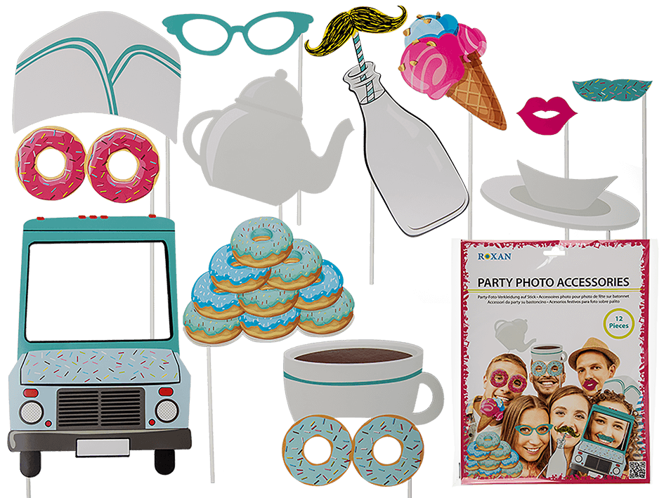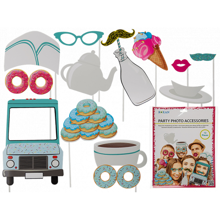 Kit de 12 accessoires de PhotoBooth, pour une séance photo fun et décalée sur le thème Donut. Apportez du pep's et de la folie à votre soirée, et organisez une séance photo avec vos amis.
