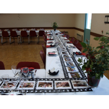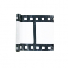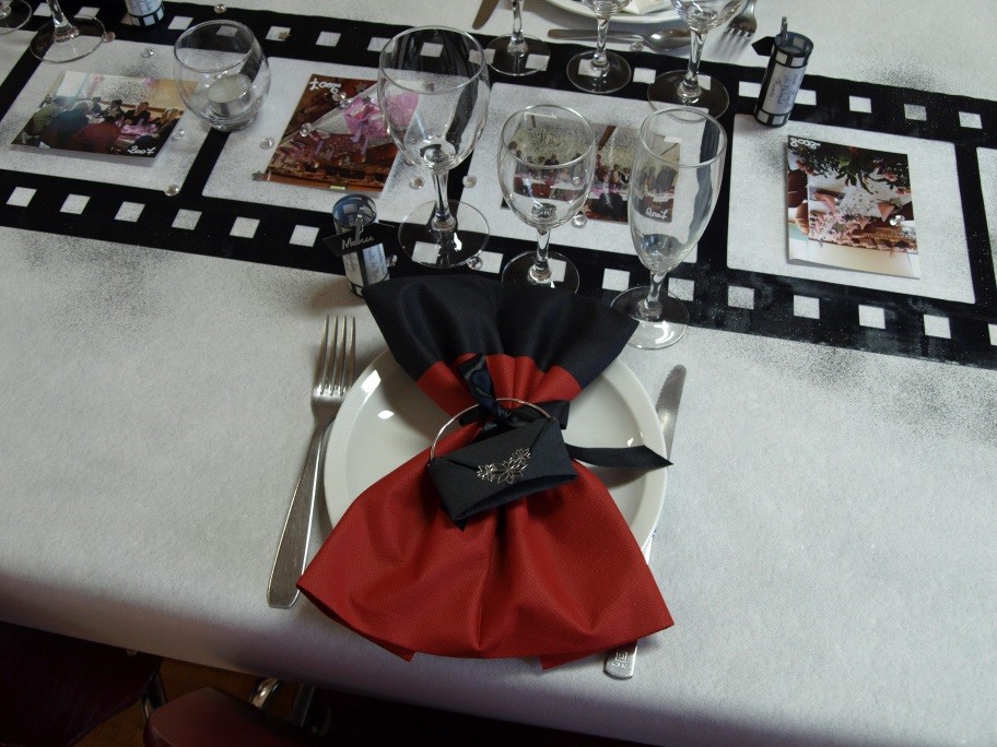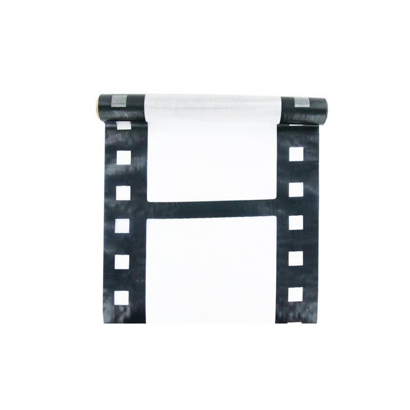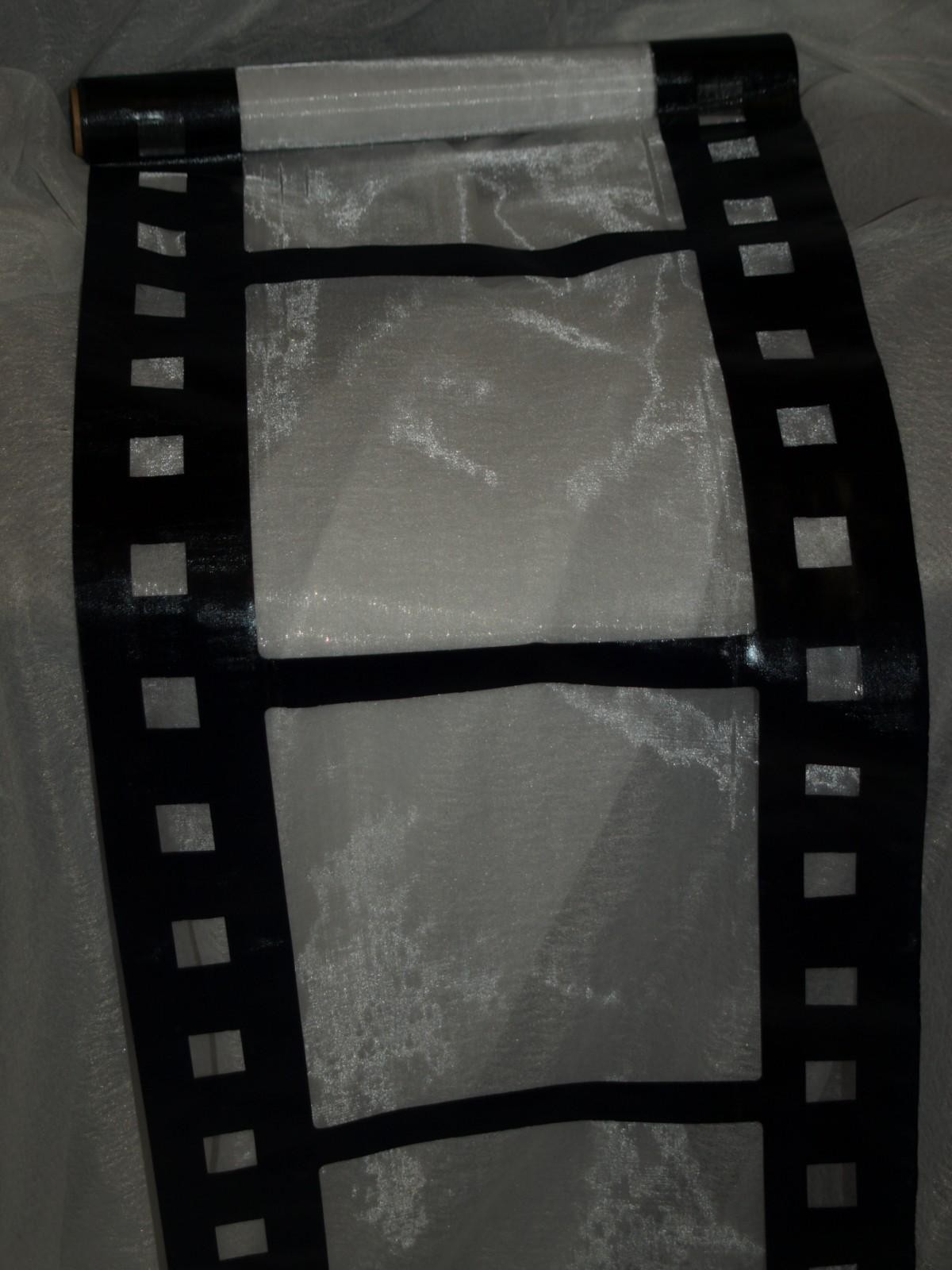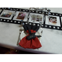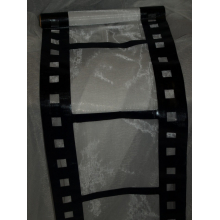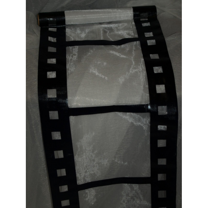 Un chemin de table cinéma avec une pellicule noire. Chemin de table en organza blanc avec impression noir.