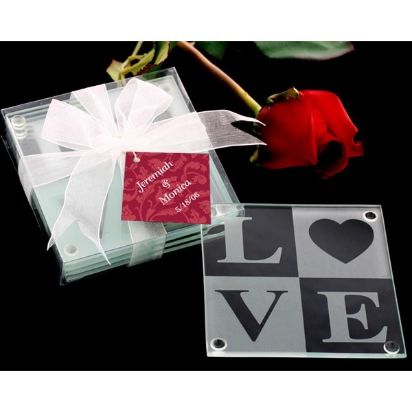 Le mot "love" est marqué en gros sur le dessous de verre avec un "o" en forme de cœur.
