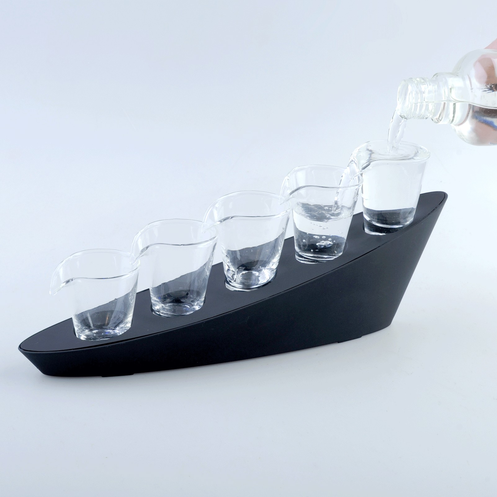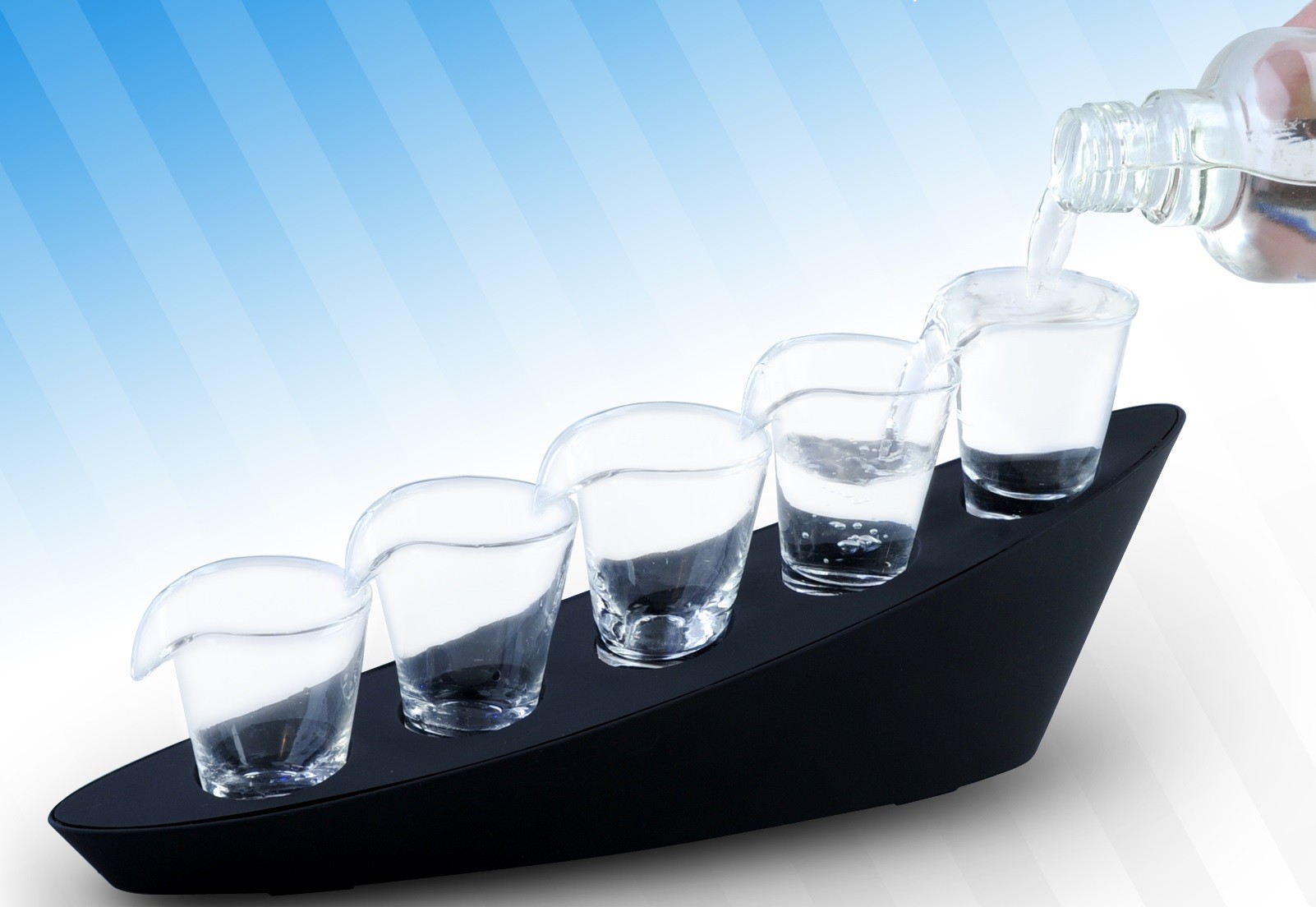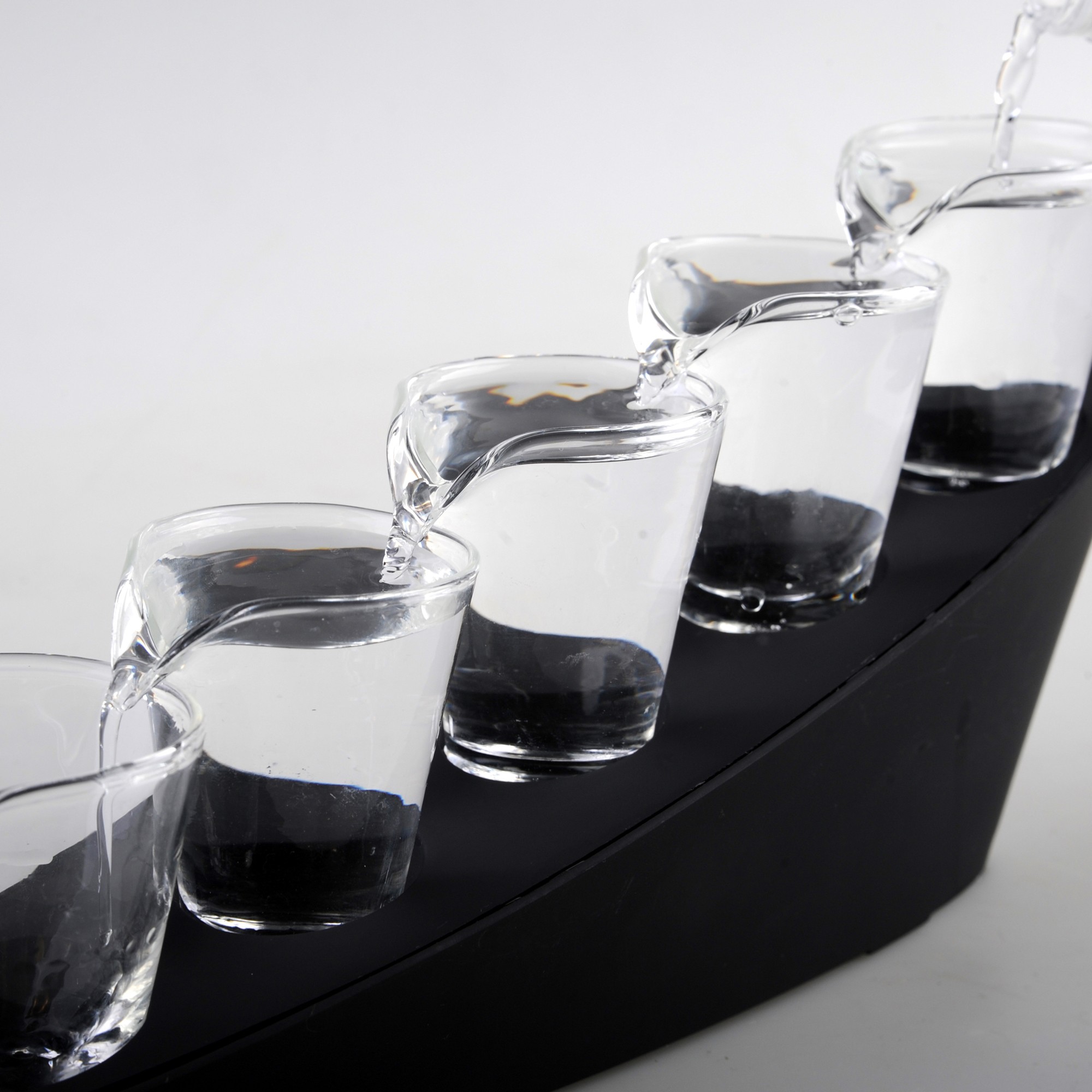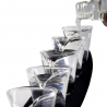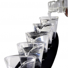 Lorsque vous versez un liquide dans le verre le plus haut, celui-ci se remplit et se déverse dans le verre en dessous ainsi de suite jusqu'à remplir les 5 verres à liqueur d'une contenance de 40 ml.
