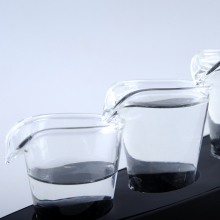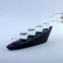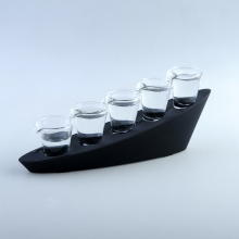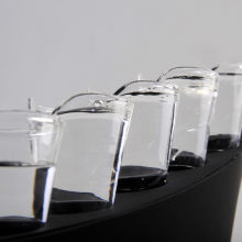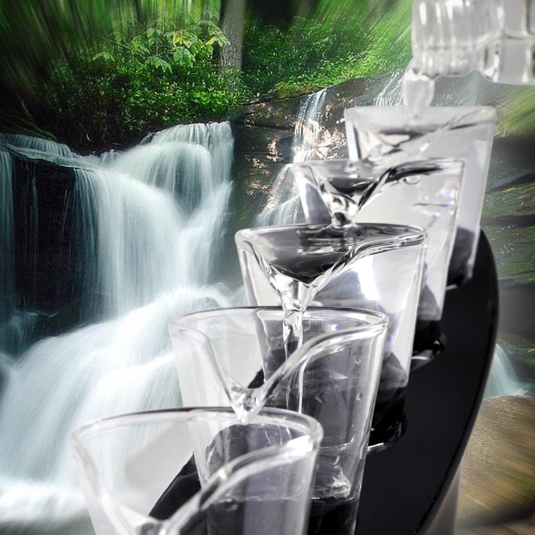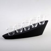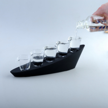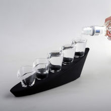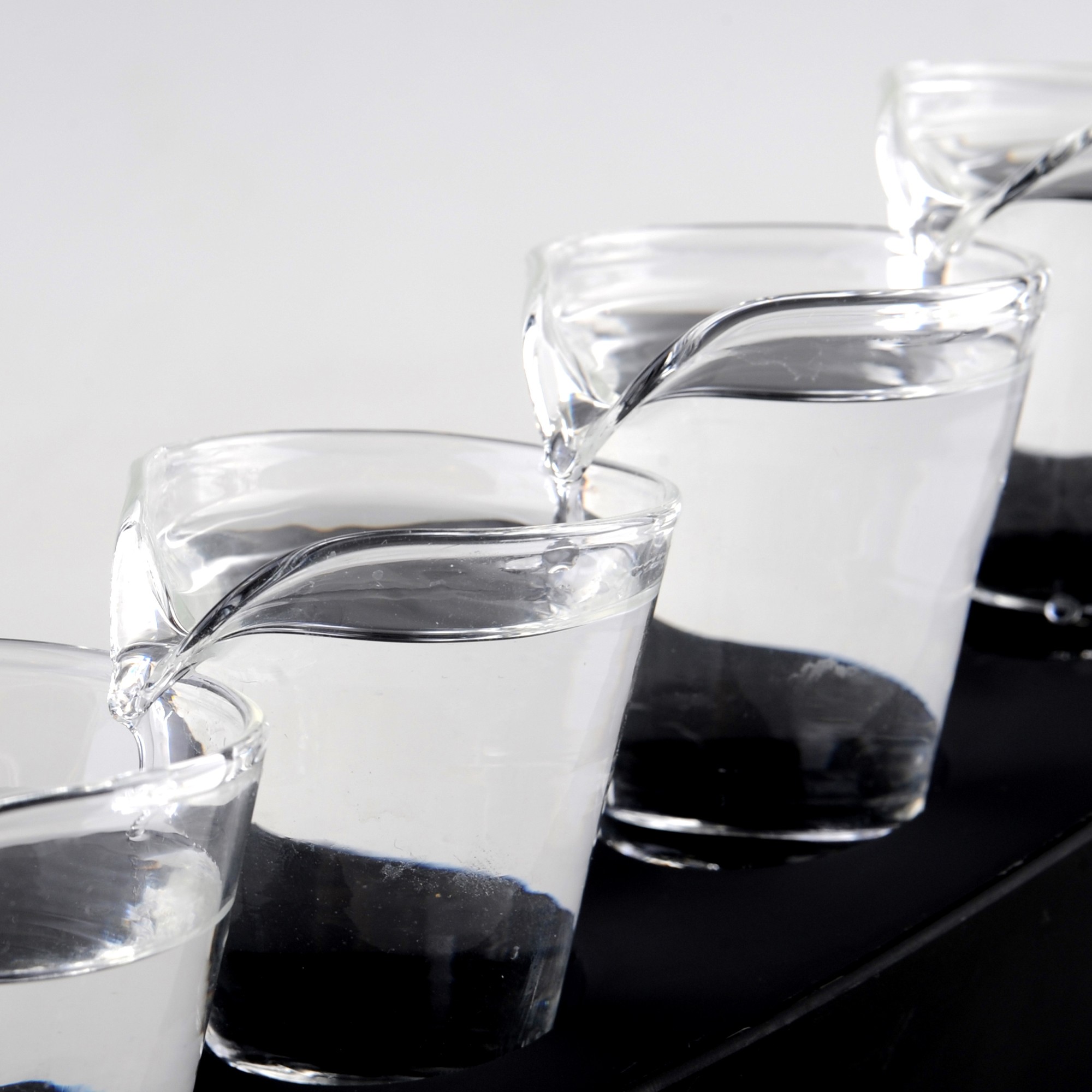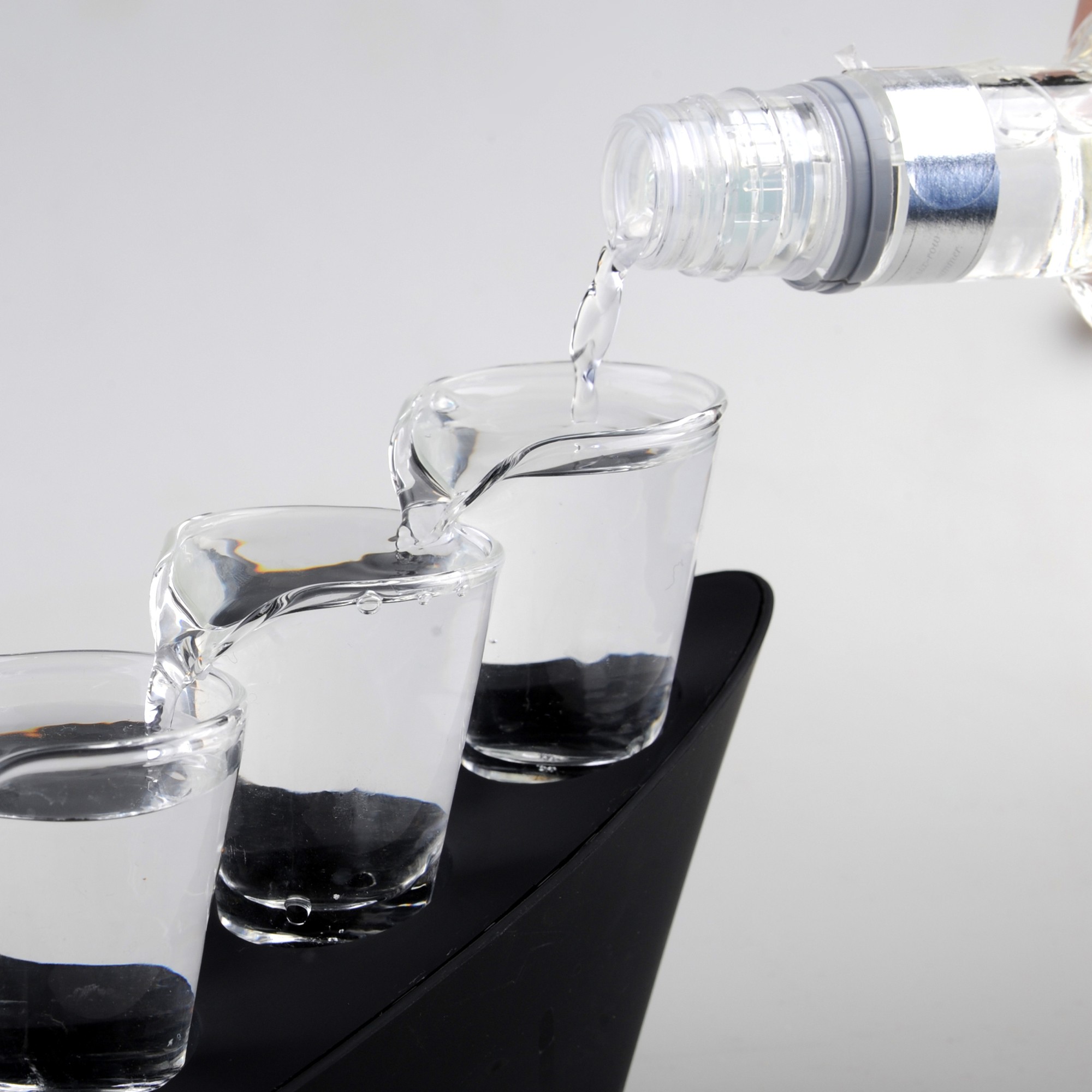 Lorsque vous versez un liquide dans le verre le plus haut, celui-ci se remplit et se déverse dans le verre en dessous ainsi de suite jusqu'à remplir les 5 verres à liqueur d'une contenance de 40 ml.