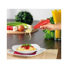 Il suffit de piquer dans l'assiette et d'appuyer sur le bouton pour que les spaghettis s'enroulent proprement et sans effort.