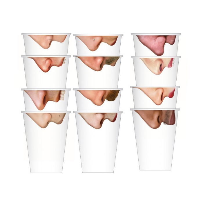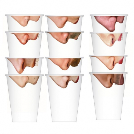 Les gobelets avec des photos de nez et bouches sont humoristiques.
