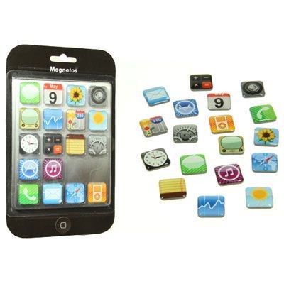 Vous cherchez un cadeau original pour un fan de nouvelles technologies ou un ado accro à son portable ? Offrez-lui ce lot de 18 magnet saimants style applications iphone pour décorer son frigo !