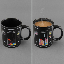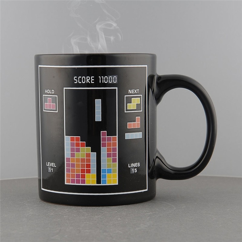Le mug fait apparaitre des petites briques empilables lorsque l'on met une boisson chaude dedans, un tetris amusant et intriguant !