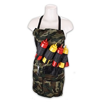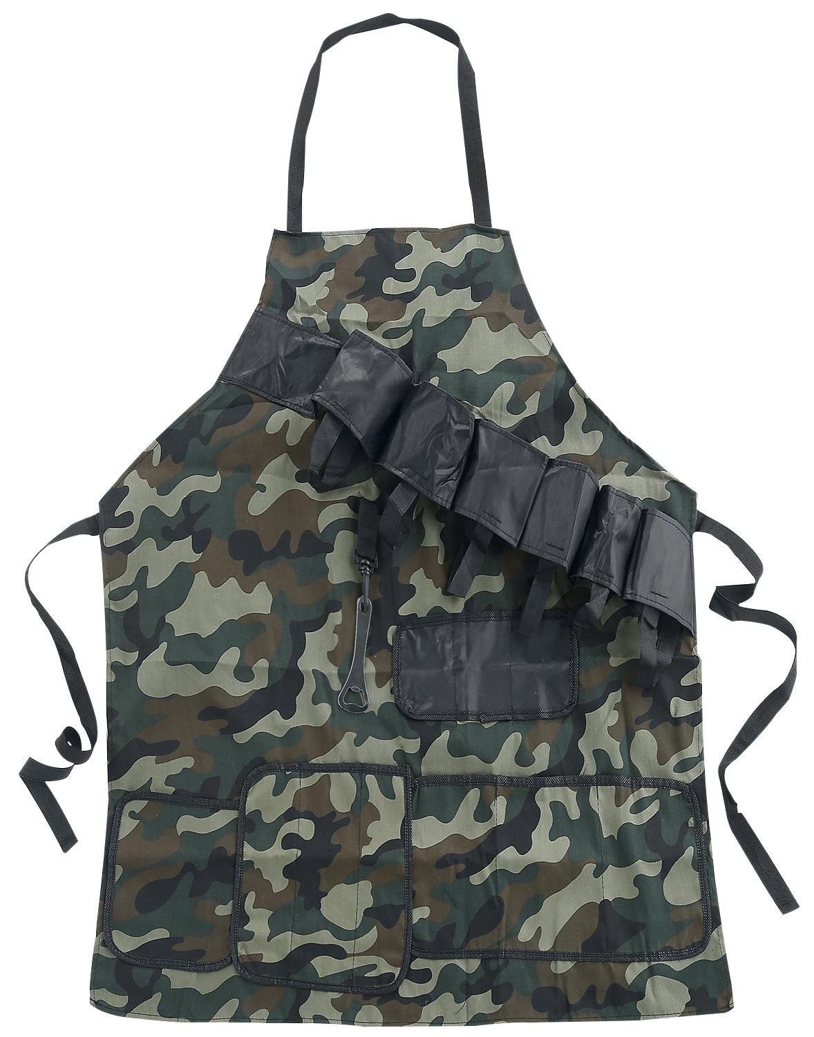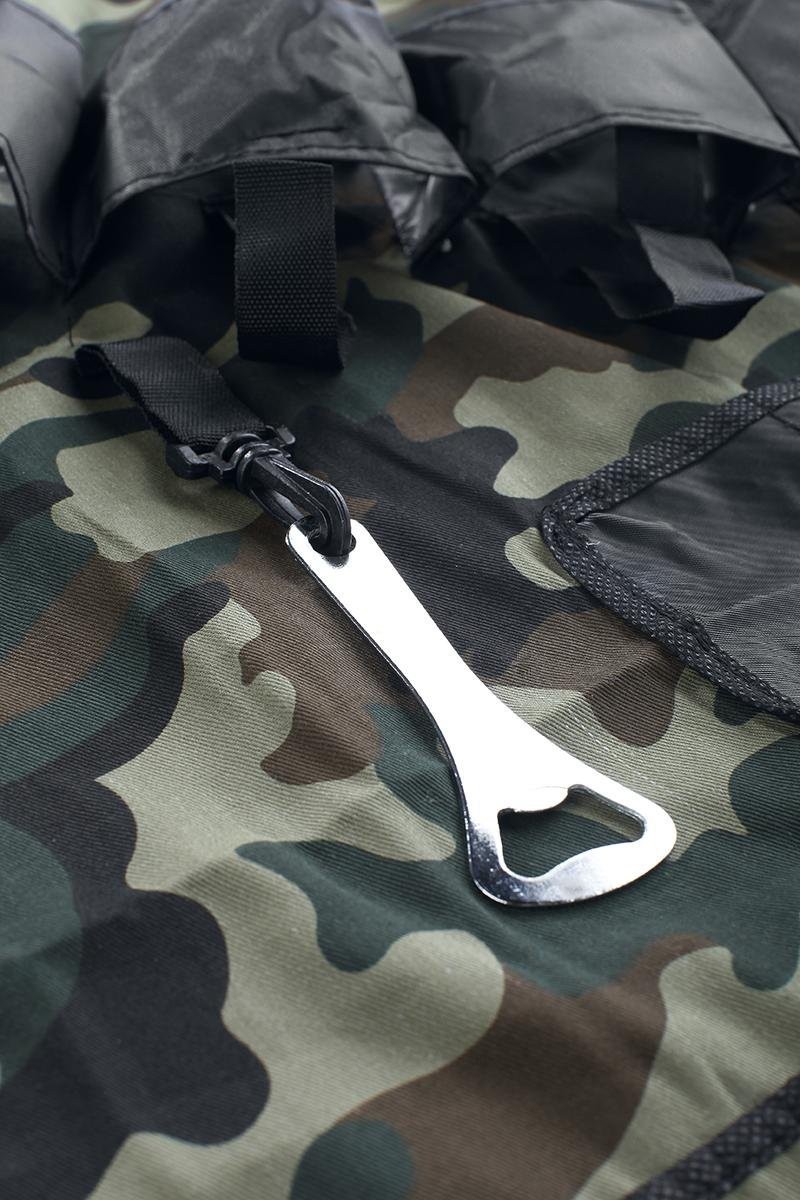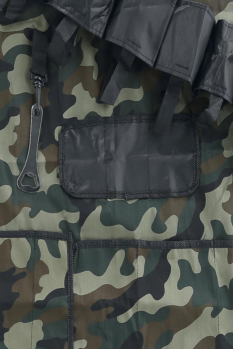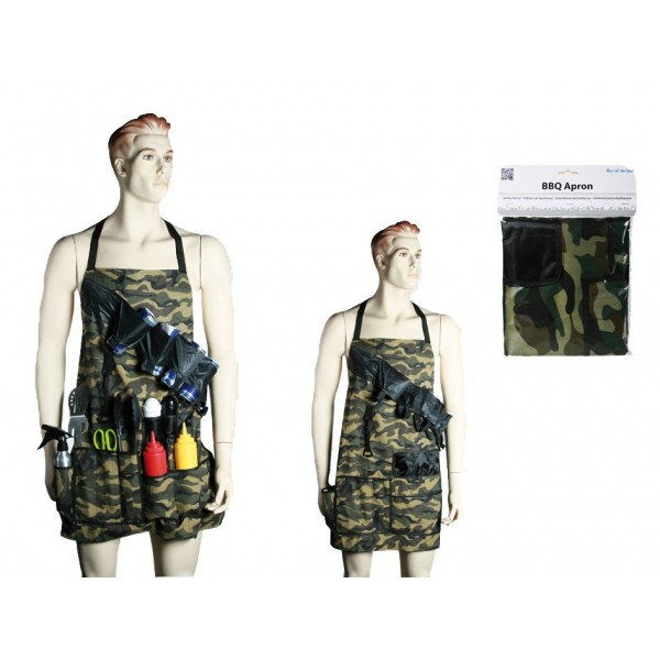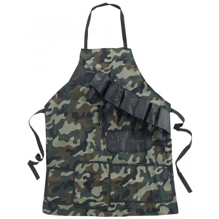 Tablier barbecue camouflage militaire avec accessoires : 6 porte cannettes, 10 porte ustensiles, 1 ouvre bouteilles. Finis les allers retours dans la cuisine, vous aurez toujours tout sous la main en surveillant le barbecue.