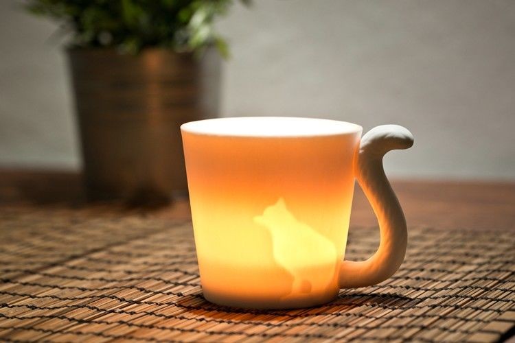 Magnifique tasse en porcelaine blanche avec un dessin gravé de chat et une anse en forme de queue de chat. Ce mug est une idée cadeau originale qui peut aussi servir de jolie décoration d'intérieur quand on la transforme en lanterne avec une bougie chauffe plat.