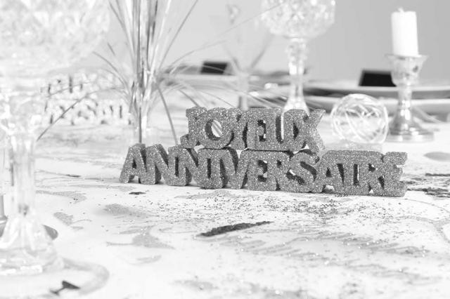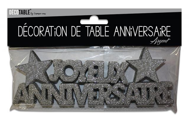 Une décoration de table à poser marquée "Joyeux Anniversaire" avec deux étoiles.