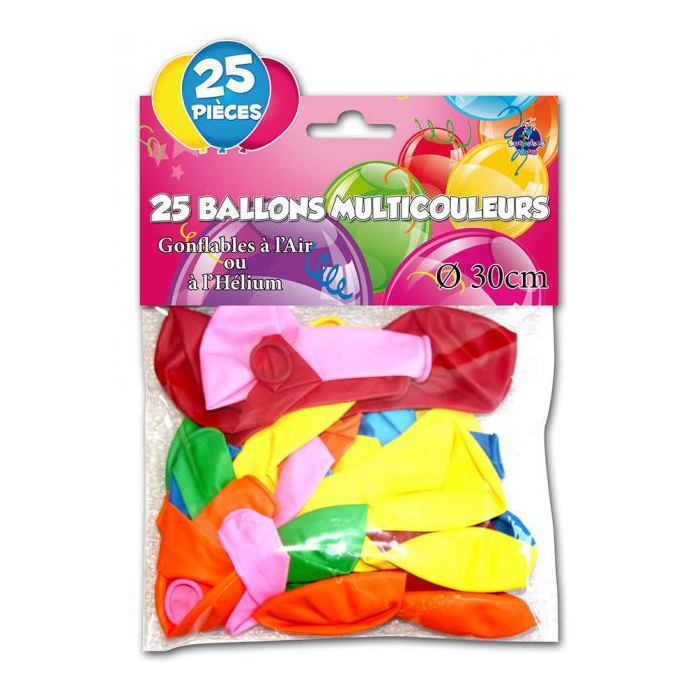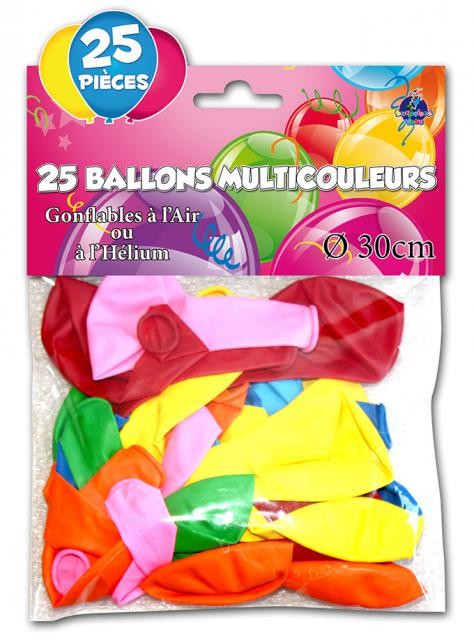 Le lot est composé de 25 ballons multicolores composés à 100% de latex, garantis air ou hélium et les couleurs sont assorties dans le sachet.