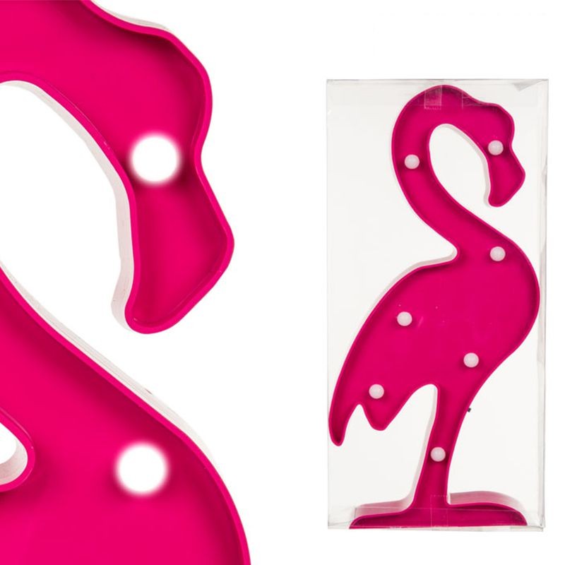 Lampe à poser en forme de flamant rose, en plastique avec 7 ampoules LED, lumière blanche chaleureuse. Fonctionne avec 2 piles AA 1,5V, vendues séparément. Utilisation exclusivement en intérieur.