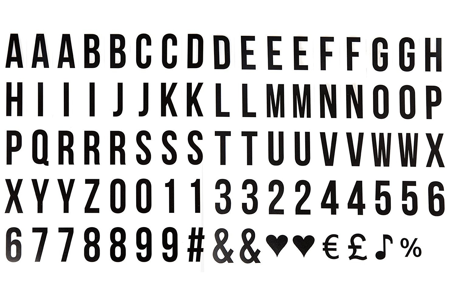 La Lightbox Tableau Lumineux à messages est livrée avec 84 Lettres et Symboles : 1x Q-X, 2x B-C-D-F-G-H-J-K-L-M-N-O-P-T-U-V-W-X, 3x A-E-I-R-S, 2x 0-1-2-3-4-5-6-7-8-9, 1x #-€-£-%-note de musique, 2x &-coeur.