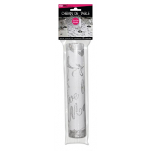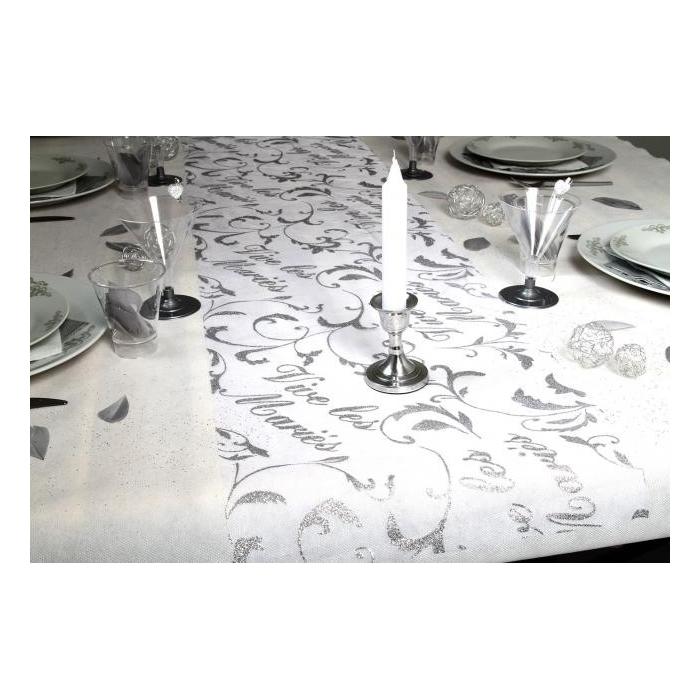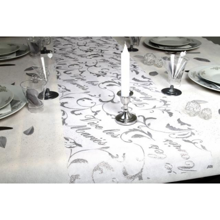 Le chemin de table habille vos tables de fête pour le plus grand plaisir de vos invités ! Des motifs avec le message "Vive les Mariés" sont imprimés en relief en gris pailleté.