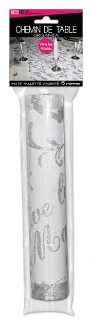 Chemin de table en organza blanc Vive les Mariés. Impression en relief gris pailleté. Dimensions : 30 cm x 5 mètres
