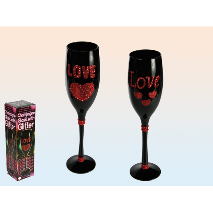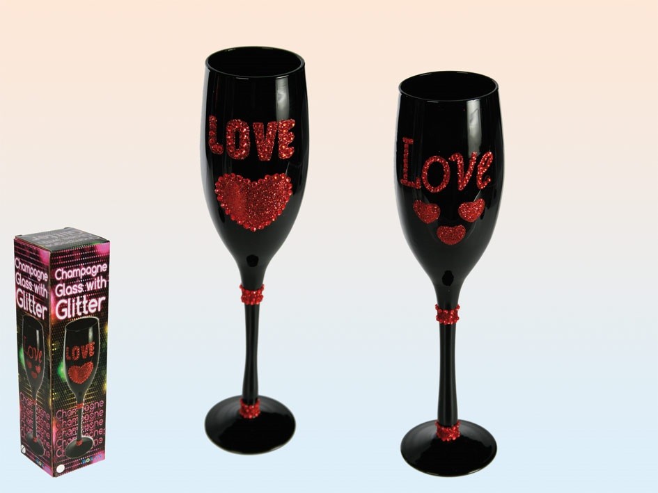 Nous vous proposons la flûte à champagne noire personnalisée marquée "Love" avec des cœurs (1 ou 3 selon arrivage).