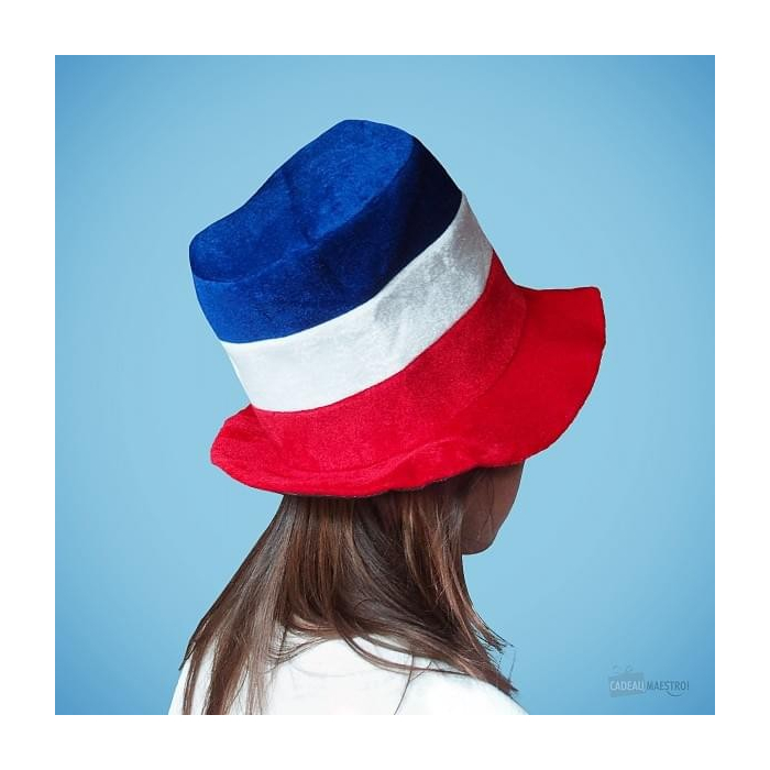 Le chapeau est aux couleurs de la France : bleu blanc rouge