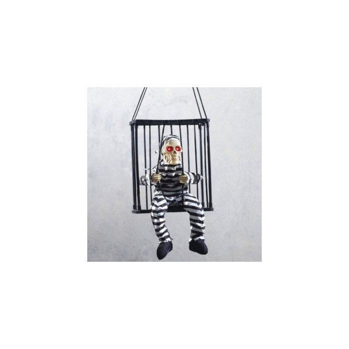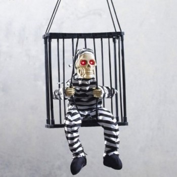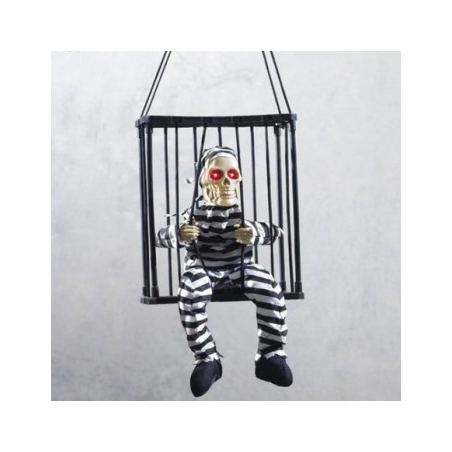 Grand squelette prisonnier animé et sonore en cage, totalement délirant, pour les petits et les grands.