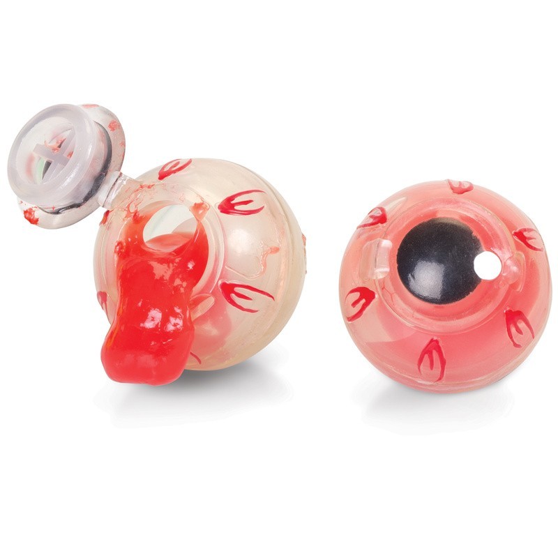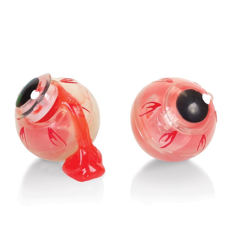 Balle rebondissante et clignotante en forme d'œil. Lorsque l'œil rebondit, une lumière rouge puis bleue clignote de son centre. Soulever l'iris pour découvrir une substance visqueuse rouge à l'aspect d'une pâte slim. Disponible en 2 couleurs différentes envoyée aléatoirement (noir ou bleu). 5 cm de diamètre