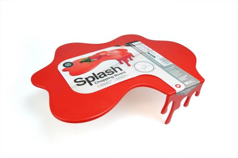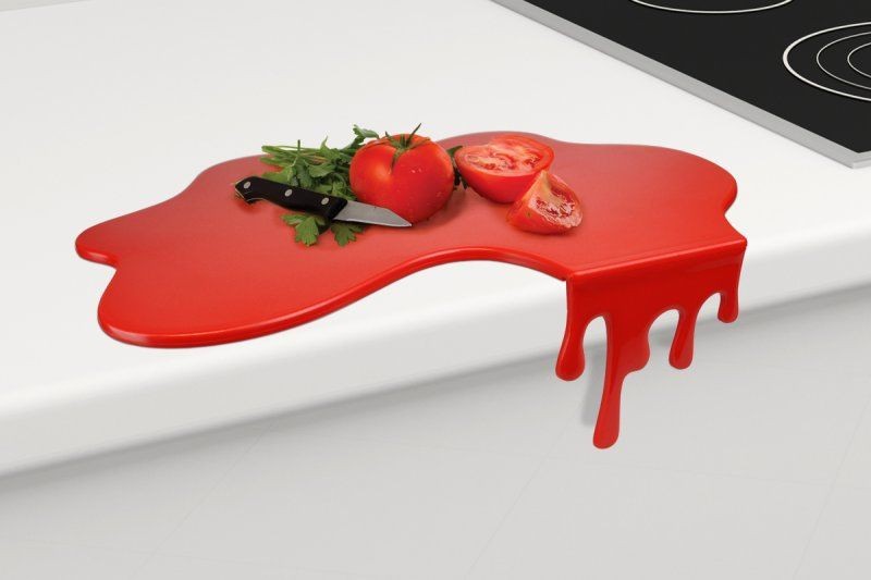 Cette planche à découper donne l'impression d'une énorme tâche de sang ou de jus de tomates. La planche à découper Splash se positionne sur le bord du plan de travail pour une utilisation optimale.