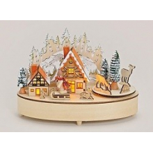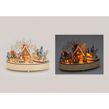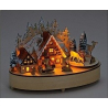 Une scène de noël en bois lumineuse avec de la musique et une plateforme tournante.