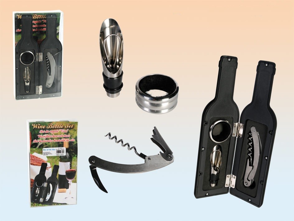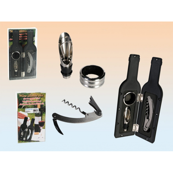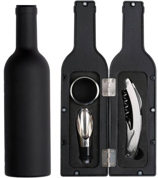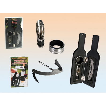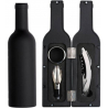 Set coffret de 3 accessoires pour le vin en forme de bouteille avec fermeture aimantée.