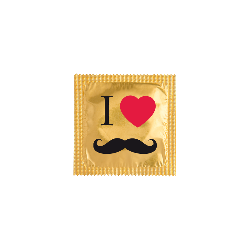 Préservatif humoristique I LOVE MOUSTACHE en latex. Fabriqué en France aux normes NF et CE. Vendu à l'unité.