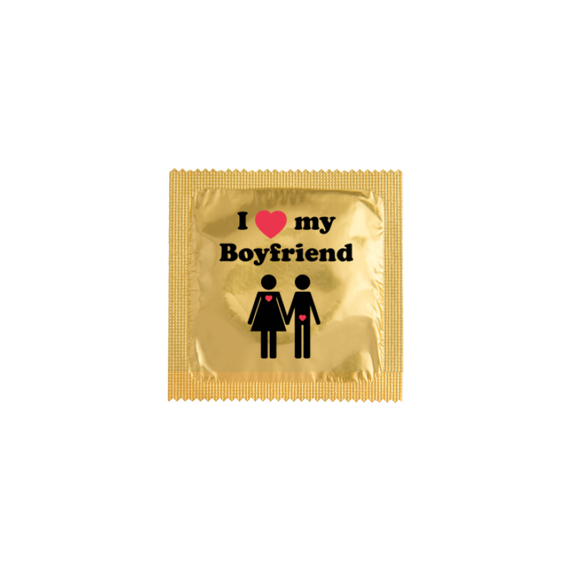 Le préservatif humoristique I LOVE MY BOYFRIEND sur fond doré est réservé aux femmes amoureuses. C'est le cadeau idéal pour votre amie qui commence une histoire d'amour ou qui ne veut pas tromper son boyfriend !