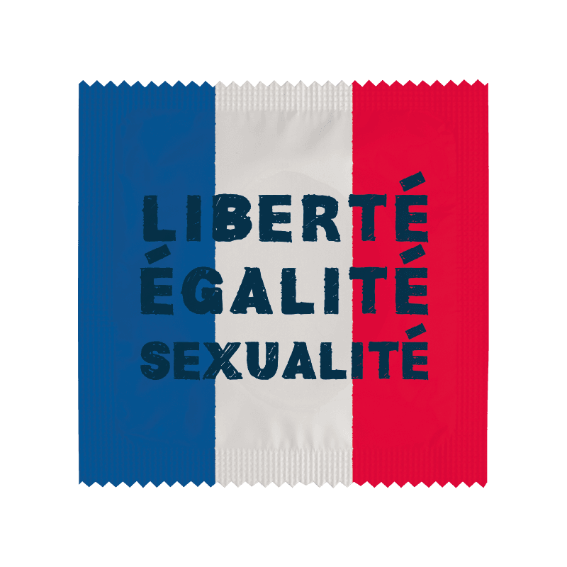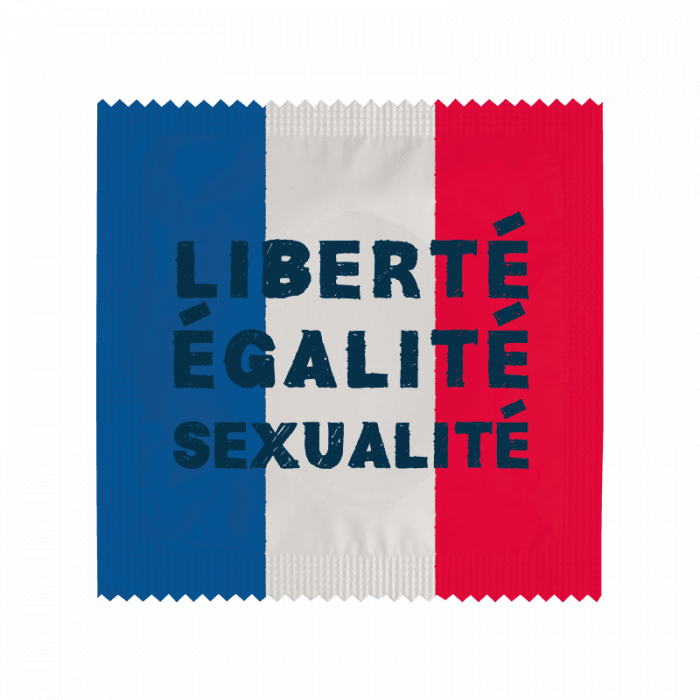 Préservatif humoristique LIBERTE EGALITE SEXUALITE en latex. Fabriqué en France aux normes NF et CE. Vendu à l'unité.