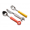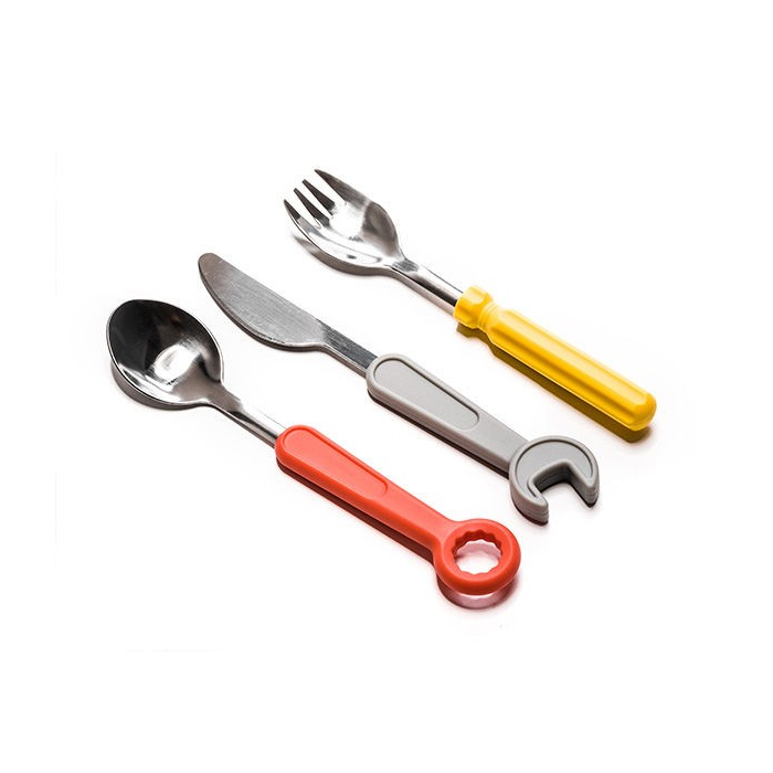 Les couverts outils sont une cuillère en forme de clé à oeil, un couteau en forme de clé plate et une fourchette tournevis pour les enfants bricoleurs !