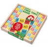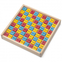 Plateau en bois composé de 9x9 cubes en bois de 3 couleurs différentes (= 81). Chaque cube représente une multiplication qu'il faut placer dans la bonne case sur laquelle est marqué le résultat de 1 à 81.