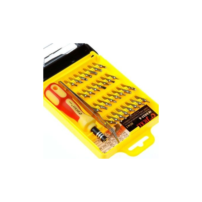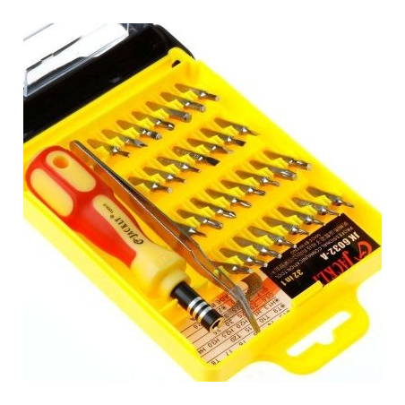 Le kit est composé de 32 embouts de précision et un tournevis aimanté ainsi qu'une pince de précision pour les petites pièces.