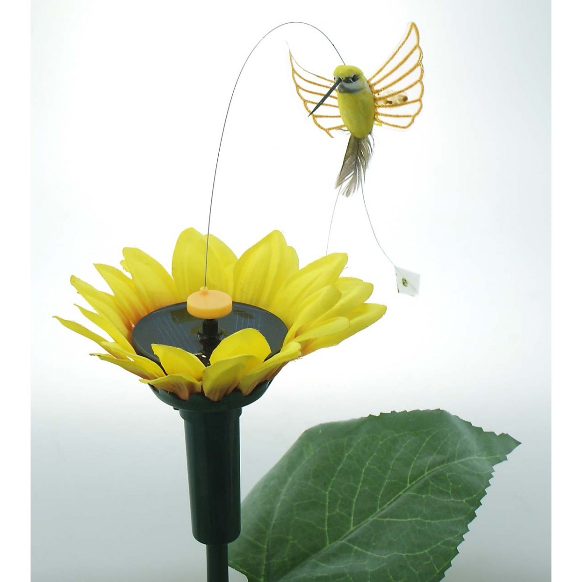 Grâce à l'énergie solaire, l'oiseau vole autour de la fleur de tournesol dans les airs.