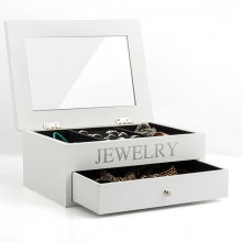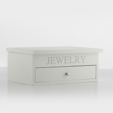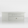 Ce magnifique rangement à bijoux en bois est blanc et marqué "Jewerlry" en argent, la poignée du tiroir est couleur or.