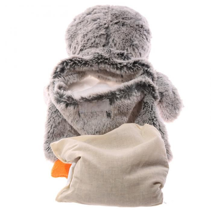 La peluche pingouin dispose d'une poche pour mettre la bouillotte micro ondable fournie.